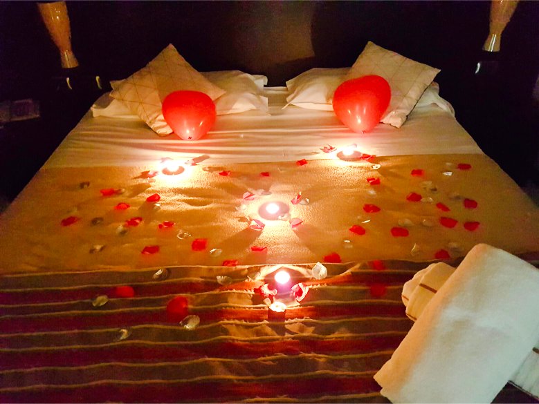 - allestimento della camera a tema romantico con delicati petali di rosa, cioccolatini e bottiglia di spumante millesimato